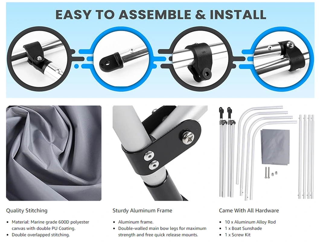 Hliníkový predlžovací čln. Vhodný pre nafukovací čln, kanoe, kajak, rybársky čln. Náš lodný tienidlo vás ochráni pred slnkom a dažďom, ideálne pre člny Runabout, člny s trupom, Jon Boat, basové člny, nafukovacie člny, člny zo sklenených vlákien Zhejiang Jiayu Outdoor Products Co., Ltd môžete dokončiť za pár minút bez akýchkoľvek špeciálnych nástroje, aby ste ho mohli jednoducho a rýchlo nainštalovať.