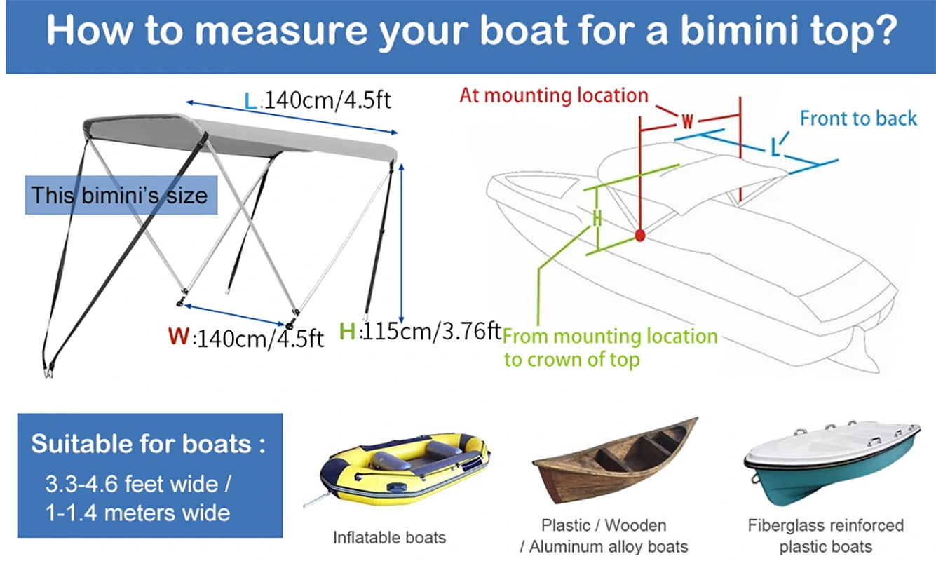 Baldachýn vyrobený z oxfordskej látky 210D, odolný voči vlhkosti a dažďu. 210D námorný materiál Bimini top je multifunkčná slnečná strieška na more, ktorá odolá slnečnému žiaru a udrží vás a vašu rodinu, aby ste si mohli vychutnať bezpečný pohodlný a voľný zážitok na mori.