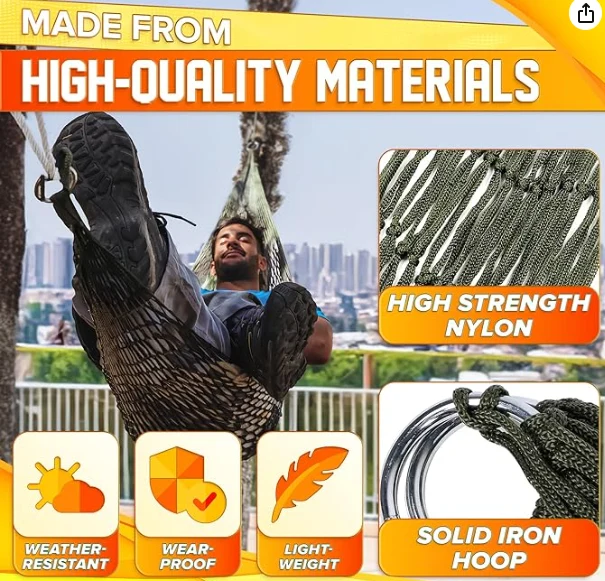 Túto hojdaciu sieť na turistiku, táto hojdacia hojdačka nylonu má vysokú zaťaženú kapacitu. Tieto hojdačky nylonového lana sú ideálne pre vnútorné a vonkajšie kvôli vysokej odolnosti a odolnosti voči opotrebovaniu a roztrhnutiu