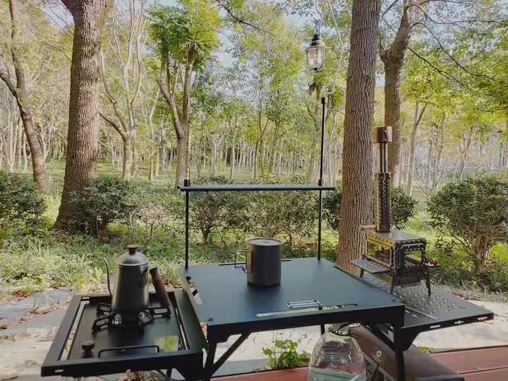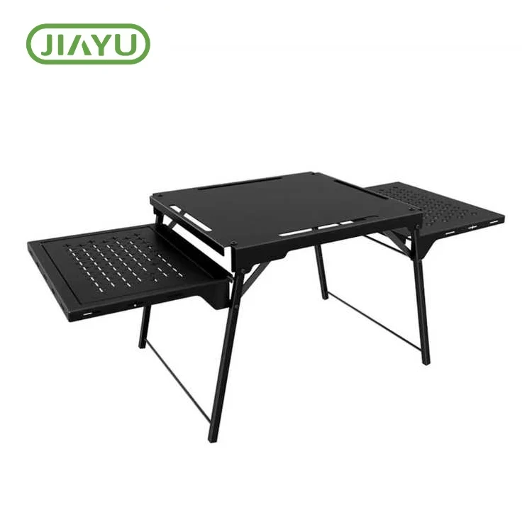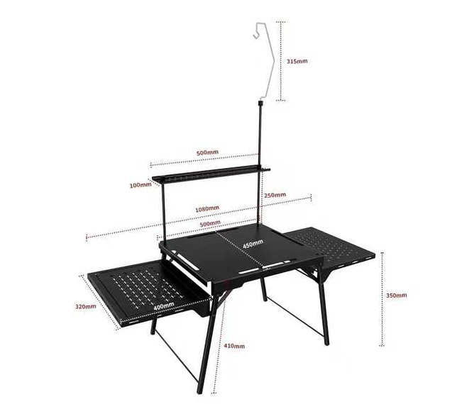 Prenosný skladací kempingový stôl z hliníka a železa, platforma jedálenského stola sa skladá z horných, stredných a dolných častí s dostatočným priestorom na ukladanie všetkých druhov riadu, jedla a korenia.