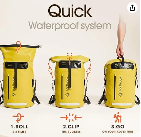 Vodotesné suché tašky na batoh. Veľký zips odolný voči striekaniu na vonkajšej strane pre rýchle uchopenie a gool položky a vstavané vrecko na zips, priehradku na sieť a kľúče vo vnútri. Pohodlné D-krúžky pripevnené k ramenným popruhom a opakujúcim sa systémom Molle poskytujú zakotvené body, na ktoré sa majú zachytiť pri plavbe alebo na bicykli.